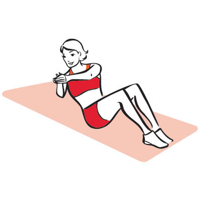 Сядьте на мат, локти слегка согнуты, руки поставьте на мат сзади вас, пальцы смотрят вперед. Поддерживая колени вместе, вытяните ноги и оторвите пятки от пола примерно на 5 см. Отклонитесь спиной назад, опираясь на руки (но не сильно), и на 10 счетов подтяните колени к груди (показано на рисунке). В конечной точке задержитесь на 2 секунды и на 10 счетов вернитесь в стартовую позицию.