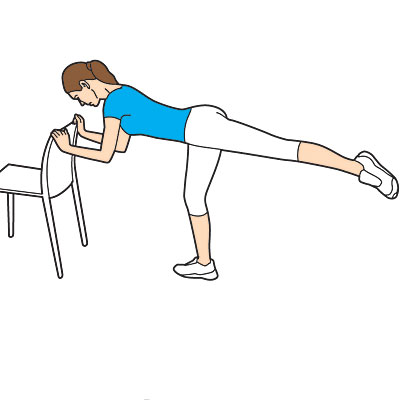 Встаньте за стулом на расстоянии вытянутых рук, сами руки лежат на спинке стула. Наклонитесь вперед так, чтобы корпус стал параллелен полу, локти согните под углом 90 градусов и поднимите левую ногу назад, чтобы она оказалась на одном уровне с корпусом. Слегка согните правое колено, пресс сохраняйте напряженным. Сделайте в этом положении несколько коротких пружинок, затем опустите ногу вниз. Сделайте 20 повторов с каждой ноги.