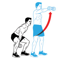 Держите гантель хватом сверху на вытянутой руке перед собой на уровне талии. Ноги поставьте чуть шире плеч, согнитесь в тазе и коленях и наклоните корпус вперед примерно на 45 градусов. Замахнитесь гантелью между ног и толкните бедра вперед, выпрямляясь и одновременно делая мах гантелью до уровня груди. Вернитесь обратным движением назад и повторите.
