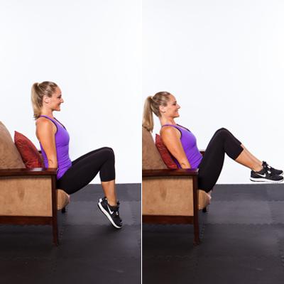Сядьте на кресло, поставьте руки край сидения и, держа себя на руках, пройдите ногами вперед (таз висит над полом, но спина находится близко к креслу). Оторвите правую ногу от пола. Согните оба локтя, делая обратное отжимание (для трицепсов) и еще ближе подтяните правое колено к груди. Отожмитесь наверх, одновременно давя на пятку левой ноги и поднимая таз, и выпрямите правую ногу вперед. Сделайте по 10 повторов с каждой ноги.
