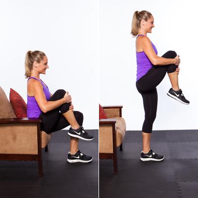 Встаньте близко к креслу спиной, подтяните правое колено к груди и обхватите его обеими руками. Согните левое колено, расслабьте таз и медленно опускайтесь вниз, пока полностью не сядете на кушетку, все еще держась за правое колено. Теперь поднимитесь наверх, продолжая держать правое колено. Сделайте 10 раз сначала на одной ноге, затем столько же на другой.