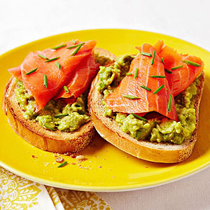 Сделайте пюре из 1/3 авокадо и намажьте его на 2 куска поджаренного ржаного хлеба. Сверху положите кусочки копченого лосося и посыпьте зеленью.