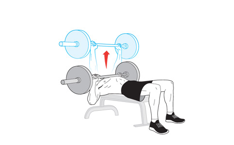 Возьмите гриф на ширине плеч и лягте спиной на скамейку, упираясь ногами в пол. Гриф держите на расстоянии 2-5 см от груди. Чуть опустите гриф вниз и сделайте жим наверх. Вернитесь в исходное положение, чтобы в согнутых локтях образовывался угол в 45 градусов. Сделайте 3-5 повторов.