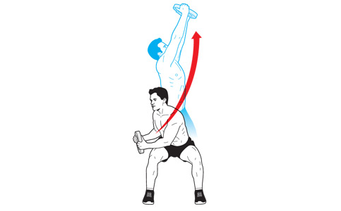 Встаньте ноги на ширине плеч, возьмите обеими руками вес от штанги. Согните колени и уведите ваш корпус влево, а потом выпрямитесь наверх и вправо, ведя вес через грудную клетку. Снова присядьте. Сделайте 5 повторов и смените стороны.